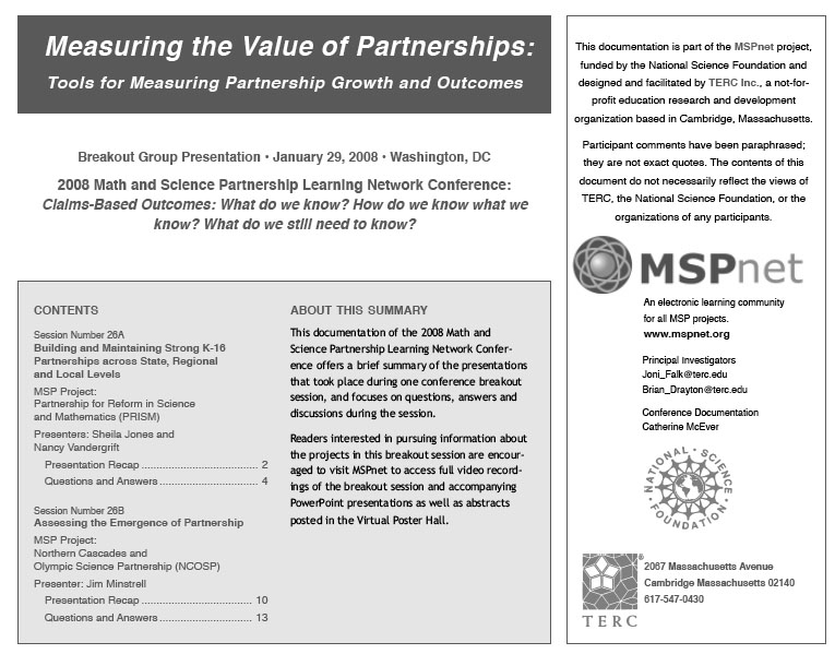 | View Breakout: Measuring the Value of Partnerships: Tools for Measuring Partnership Growth and Outcomes Breakout Session Number 26A MSP Project: Partnership for Reform in Science and Mathematics (PRISM) Presenters: Sheila Jones and Nancy Vandergrift |