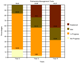 The combined results show a substantial decrease each year in the "no-progress" rating with increases in the "sustained" rating. The partnership has been able to clearly define their roles and responsibilities in order to make hard decisions when needed. The partnership has been able to support the work of all PRISM partners sharing progress on PRISM goals periodically to the Georgia Department of Education and University System of Georgia, as well through regional and local entities. Partners continue to experiment with ways to redirect non-NSF resources towards PRISM efforts and goals.