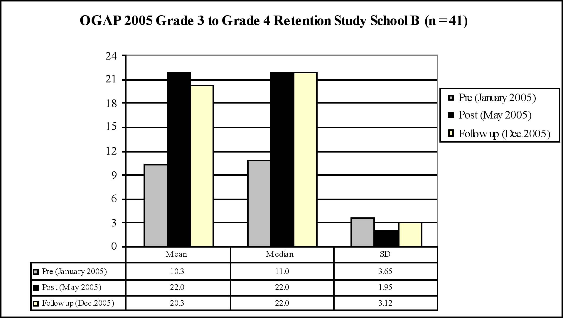 Fourth grade School B students completed the grade 3 pre-assessment items 1-12 on December 11, 2005. This was the same assessment that was administered in January 2005 and at the end of the intervention in May 2005. Three students moved or were absent the day the follow-up assessment was given. Only the students who participated in OGAP in the winter of 2005 were included in the retention study.