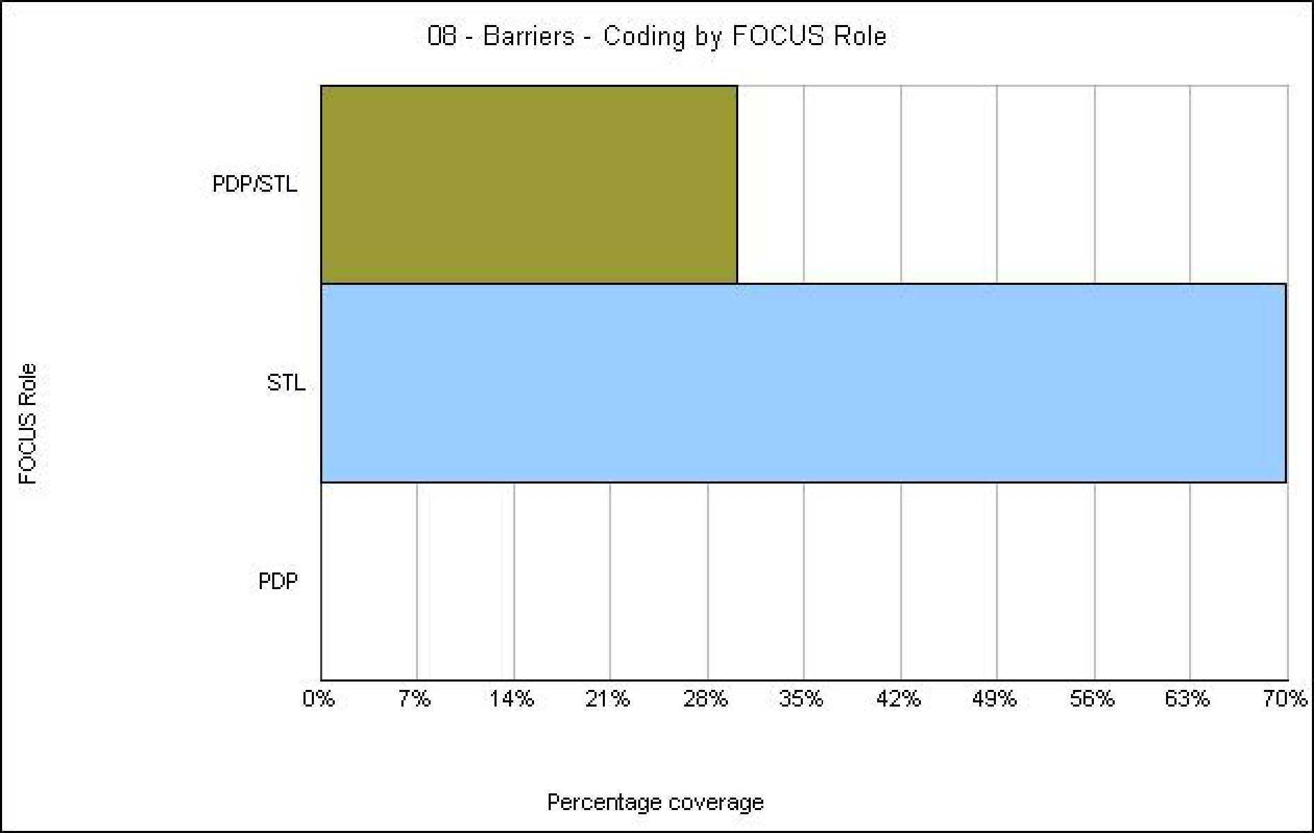 In addition to valuing the features of professional development described by Garet et al (2001) and Penuel et al (2007), the PDPs and STLs told us that they valued FOCUS' regional approach to collegial conversations as well as the relationships they developed over time (both features of FOCUS professional development not found in Garet et al (2001) nor Penuel et al (2007)). The PDPs who attended leadership institutes and who had more intense, regional involvement with the FOCUS program cited references about valuing reform orientations more often than did the Site Teacher Leaders (STLs) who had a more peripheral, localized role: