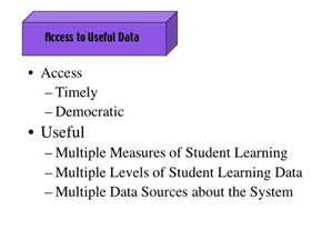 So the final building block, and I think you'll agree that this is one of the biggest challenges, is timely access to useful data. Access really has two dimensions, one is that teachers are getting the data in time to respond to it, not after they're teaching a different group of kids, and that they data are democratically available, that there isn't, you know, some little place behind lock and key where the data sit, but teachers have access to which data that they need, disaggregated data, item level data. They are the folks in the school who can respond most to the data and they need to have it in their hands. Useful data goes far beyond the state assessments. Useful data includes multiple measures of student learning, multiple levels of student learning data, and other data sources, so let me talk briefly about these. |