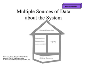 In addition to the multiple levels and the multiple measures, we need other kinds of data that help us understand what's going on in the system, so that we know what might be producing the results that we want to improve. These include data like observations about instruction, curriculum maps, surveys about teachers' perceptions of their curriculum instruction and assessment processes. Data that gives an insight into what's going into equity and access issues, like enrollment data, dropout data, interviews with students, data that give us a window into policies, leadership practices, and other dimensions of the system that need to be carefully examined. |