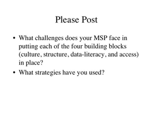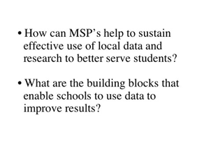 I've organized the presentation around a couple of questions. How can MSPs help to sustain effective use of local data and research to better serve students. And what are the building blocks that enable schools to use data to improve results. I'd love it if you leave the presentation feeling like you've got some discoveries about how to move toward more effective and collaborative and powerful uses of data in your own MSPs. |