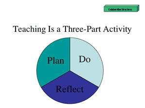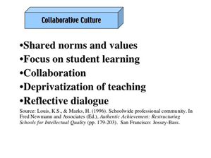 Collaborative structures are based on the assumption that teaching is a three-part activity, that it involves planning, doing, and reflecting. And typically, the way schools have been structured is to allow time only for the "do" part. So if you're not doing you're not teaching. Powerful, effective schools create the time and place for teachers to do all of their work. Their planning, their reflecting, and their working together with their colleagues. |