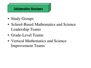The next building block is collaborative structure. These are the times and the places for groups to come together to do their work. I want to be clear that the structures have to rest on the foundation of culture, because if we create structures without culture, then folks come together and talk about matters that aren't at the center of teaching and learning, like discipline or hats in school or chewing gum. I know that many of you are creating structures like these in your MSPs, like study groups, school-based mathematics and science leadership teams, grade level teams, vertical teams. I'd love to hear in our discussion how you're using these structures and what a difference they're making. |