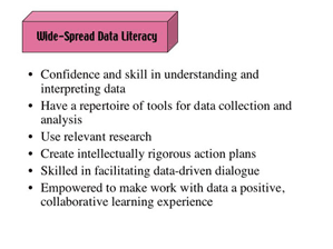 The next building block is widespread data literacy. This involves a shift from data as being a specialty of a certain group of people in this system, like maybe the research department or the assessment department, or a few central office staff or building principles, to everybody in the school community understanding how to use data. This includes being confident in the ability to understand data, make sense of it and interpret it appropriately. Knowing what you can learn from looking at fourth grade results in 2002 and a different group of fourth graders in 2003, and what you can't learn from that. Understanding when a small percentage change is significant and when it's not. A basic understanding of ideas like disaggregation, triangulation, the knowledge of statistics. A second feature of data literacy is having a repertoire of data tools, so you can conduct a root cause analysis, you can collect relevant data and make sense of it. You can display data in ways that are powerful. Data literacy also includes effective use of research, knowing when and how to access research and use it. To understand your problems better, to identify solutions. Another dimension of data literacy is the ability to talk to people about data, what we call data driven dialogue. This is a process of fence-making, being rigorous about separating your observations from the data to your interpretations of the data. So understanding that interpretations or inferences or assumptions require more data to test out. Data driven dialogue folks are clear that their assumptions are assumptions and not truth. I think with these dimensions of data literacy, school staff feel empowered to make data a positive and collaborative learning experience. |
