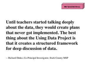 I like this quote from Richard Dinko, who's a coprincipal investigator at the Stark County MSP. And he says, "Until teachers started talking deeply about the data, they would create plans that never got implemented. The best thing about the using data project is that it creates a structure, framework, for deep discussion of data." |